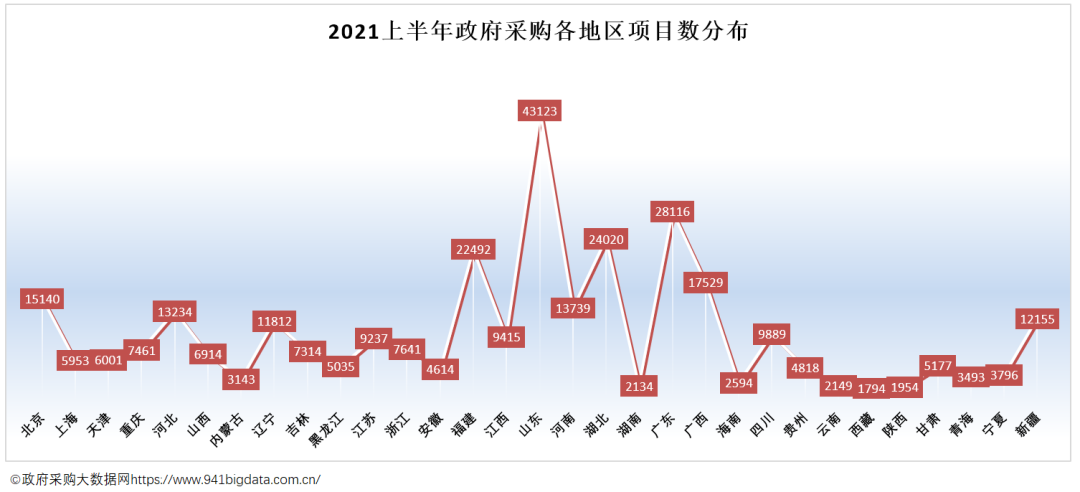 从31省(自治区、直辖市)政府采购项目数分布来看,山东省政府采购项目数量排在全国第一,其次是广东省和湖北省。