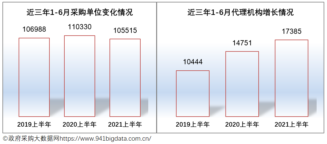 2021上半年全国政府采购市场有采购单位105515家,较去年同比减少4815家;减幅4.36%。从近三年的数据量来看,采购单位数总体上呈稳定趋势。