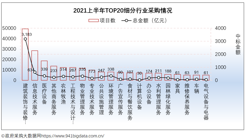从项目数TOP20采购细分行业来看,2021上半年全国政府采购排在前三的行业有建筑装饰与装修服务、信息技术服务、医疗设备。
