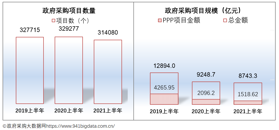 2021上半年全国政府采购项目数314080个,与去年同比减少了4.62%;项目规模为8743.33亿元,同比下降5.46%。