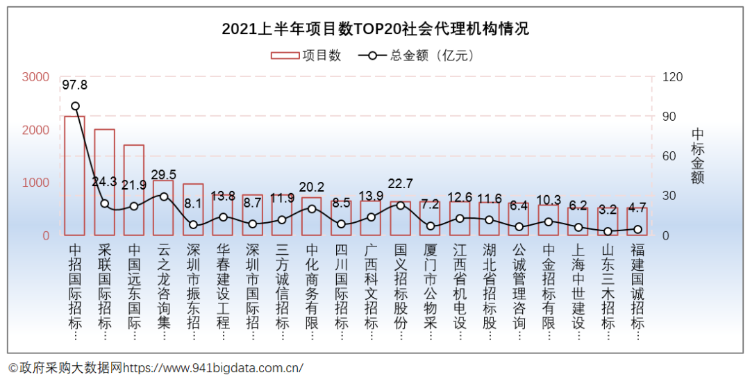 从项目数TOP20社会代理机构来看,中招国际招标有限公司在项目数量和项目金额上均占据优势。