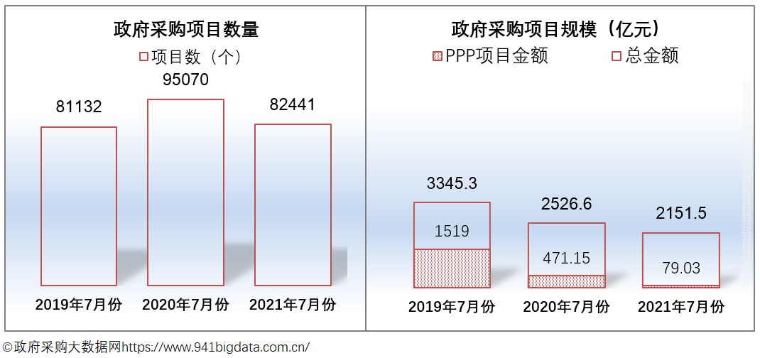 2021年7月份全国政府采购中标项目数82441个,与去年同比减少了13.28%;中标项目规模为2151.5亿元,同比下降14.85%。