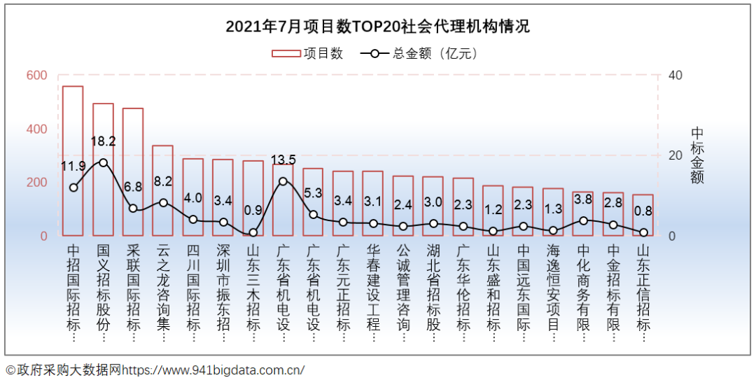 从项目数TOP20社会代理机构来看,中招国际招标有限公司在项目数量上领先;国义招标股份有限公司在项目金额上具备竞争优势。