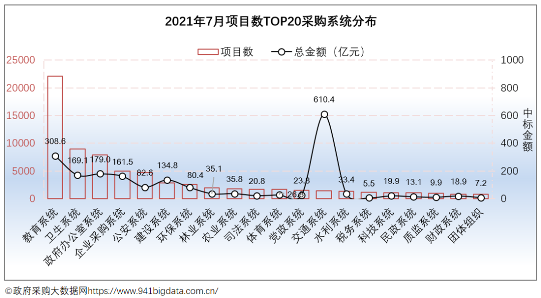 从项目数TOP20采购系统来看:2021年7月份全国政府采购教育系统项目数最为突出,共计22125个,占项目总数的26.84%,项目规模308.61亿元,占项目总规模的14.34%;