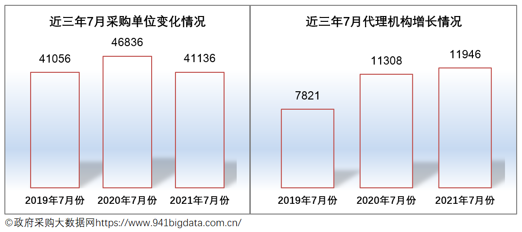 2021年7月份全国政府采购市场有代理机构11946家,较去年同比增加了638家;增幅5.64%。从近三年的数据来看,代理机构市场不断扩大,市场竞争压力也随之增加。
