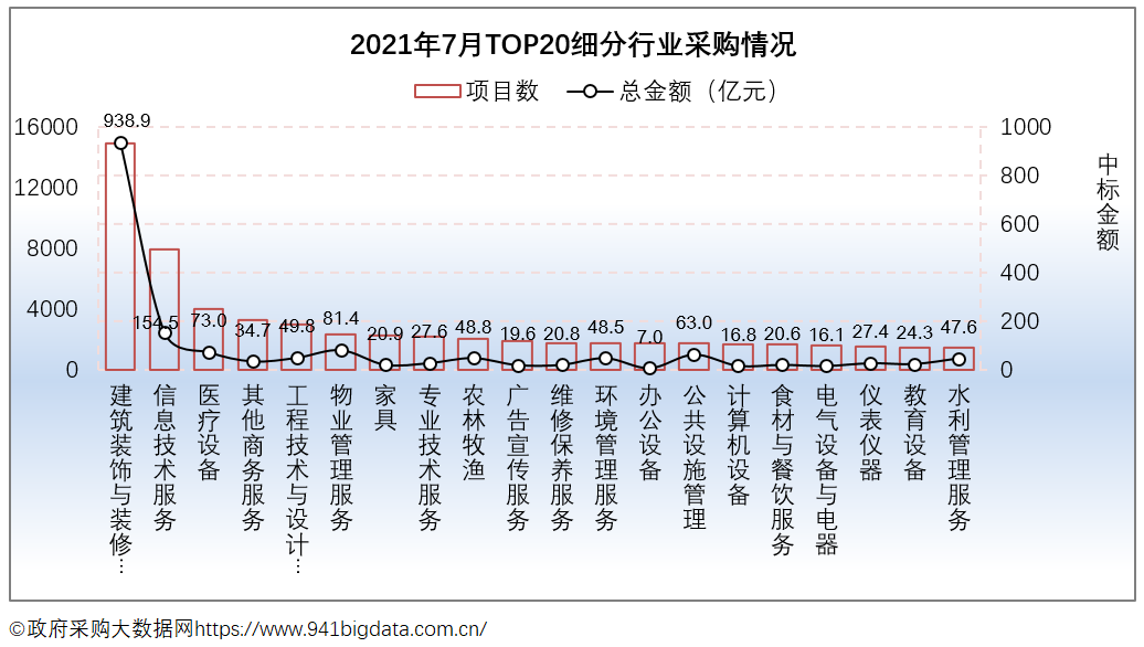 从项目数TOP20采购细分行业来看,2021年7月份全国政府采购排在前三的行业有建筑装饰与装修服务、信息技术服务、医疗设备。
