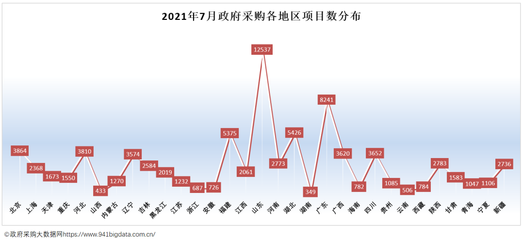 从31省(自治区、直辖市)政府采购项目数分布来看,山东省政府采购中标项目数量排在全国第一,其次是广东省和湖北省。