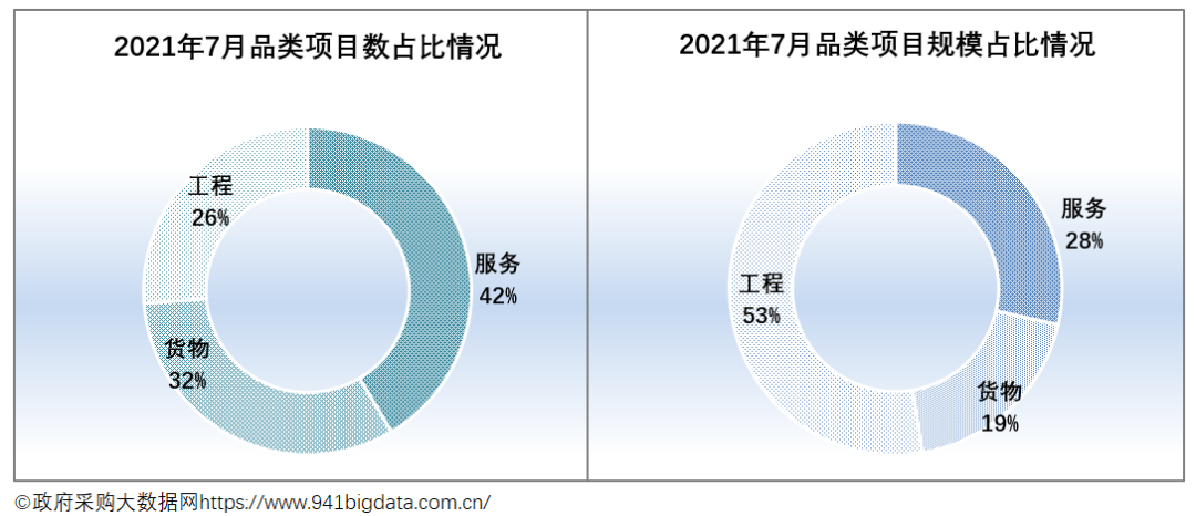 从项目采购结构来看,2021年7月份全国政府采购工程类项目规模占主导。具体来看: