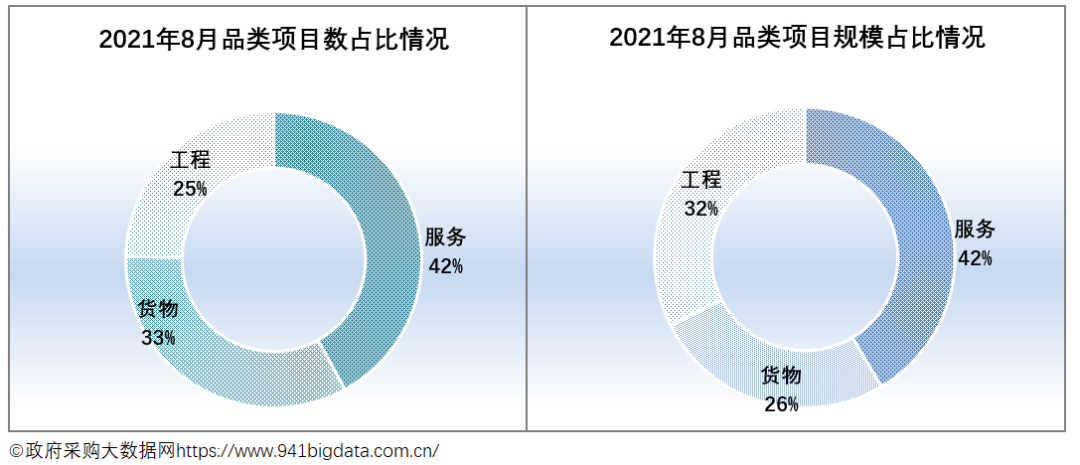 从项目采购结构来看,2021年8月份全国政府采购服务类项目规模占主导。具体来看:服务类采购项目数36028个,占项目总数的42.01%,项目规模707.18亿元,占项目总规模的41.46%;