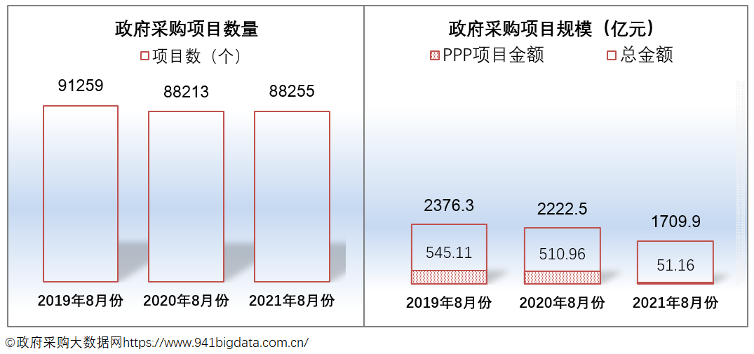 2021年8月份全国政府采购项目数88255个,与去年同比增长0.05%;项目规模为1709.94亿元,同比下降23.06%。