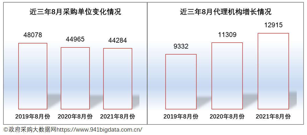 2021年8月份全国政府采购市场有代理机构12915家,较去年同比增加了1606家,增幅为14.20%。从近三年的数据来看,代理机构市场不断扩大,市场竞争压力也随之增加。