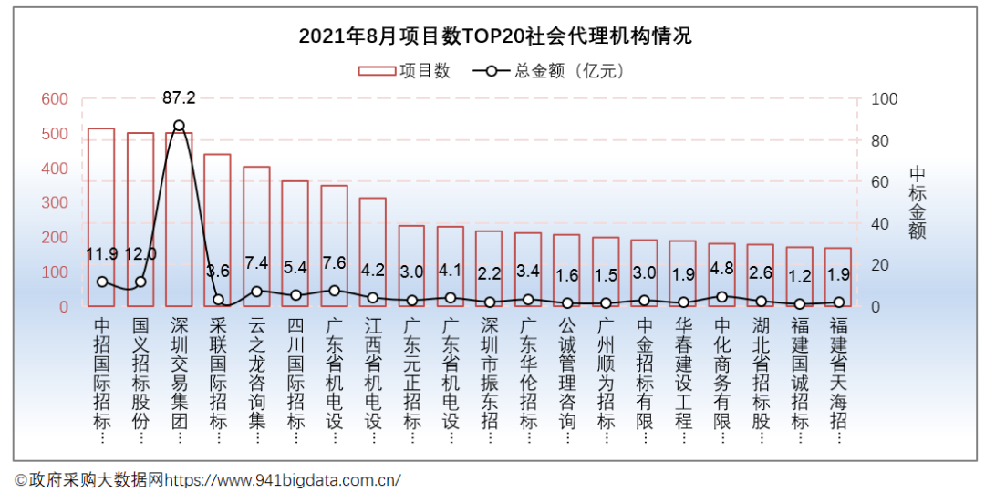 从项目数TOP20社会代理机构来看,中招国际招标有限公司在项目数量上领先;深圳交易集团有限公司在项目金额上具备竞争优势。