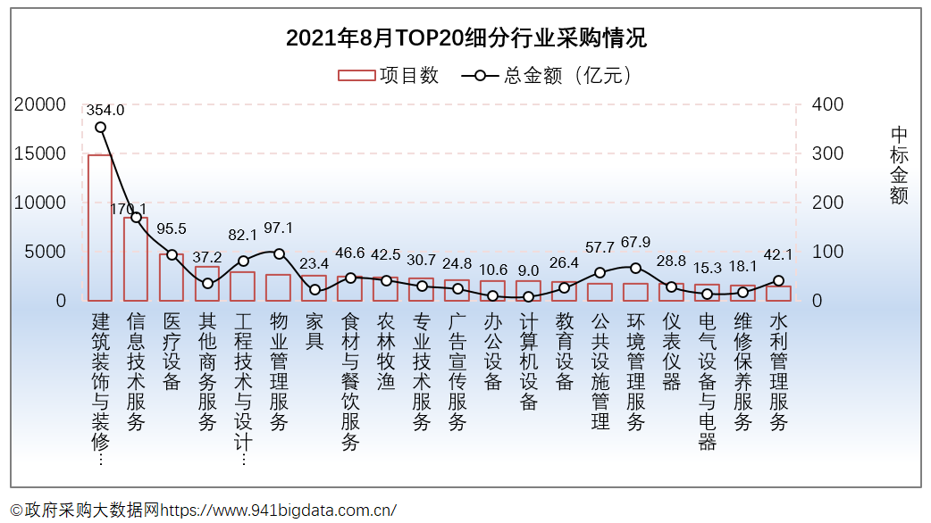 从项目数TOP20采购细分行业来看,2021年8月份全国政府采购排在前三的行业有建筑装饰与装修服务、信息技术服务、医疗设备。