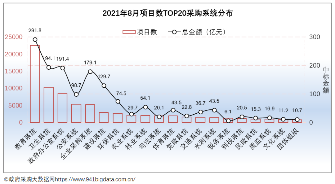 从项目数TOP20采购系统来看:2021年8月份全国政府采购教育系统项目数最为突出,共计22553个,占项目总数的25.55%,项目规模291.75亿元,占项目总规模的17.06%;