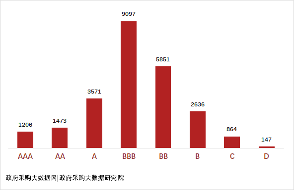 全国政府采购医疗设备服务质量信用等级AAA共有1206家,占总体的4.85%。A级及以上信用等级6250家,占总体的25.16%。B级及以上信用等级23834家,占总体的95.93%。数据显示,该行业信用等级状况整体上表现良好。