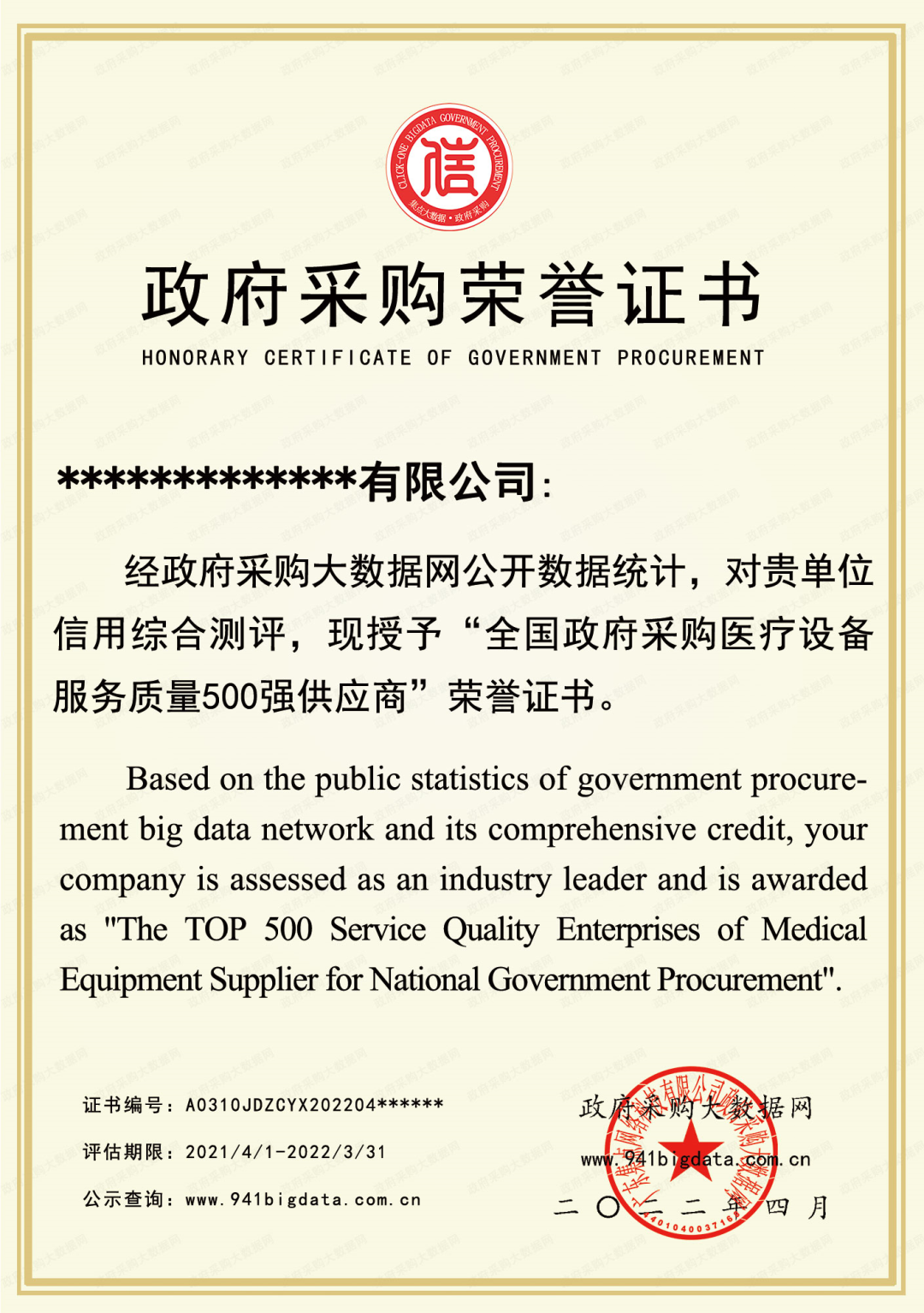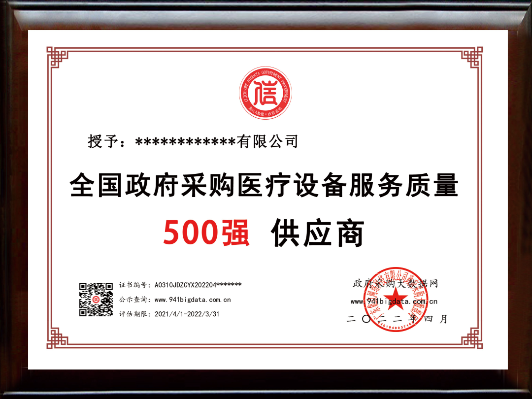 政府采购大数据网可为上榜单位出具荣誉证书(包含荣誉牌匾&荣誉证书&服务质量大数据信用报告)。解释权归政府采购大数据研究院所有。
