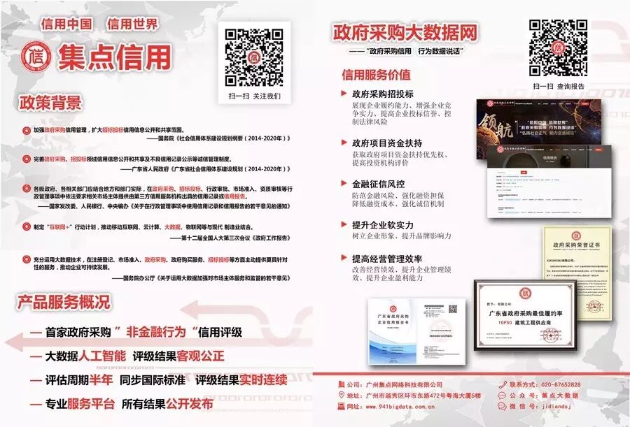 社会各界如果需要获取政府采购企业信用等级证书、企业信用报告、政府采购大数据、企业管理咨询服务等诸项内容, 敬请联系以下我司服务人员: 刘小姐:133 0239 4984 杨老师:139 2878 2990 QQ:1162350543 政府采购大数据信用网:www.941bigdata.com.cn 地址:广州市越秀区环市东路472号粤海大厦5楼 |