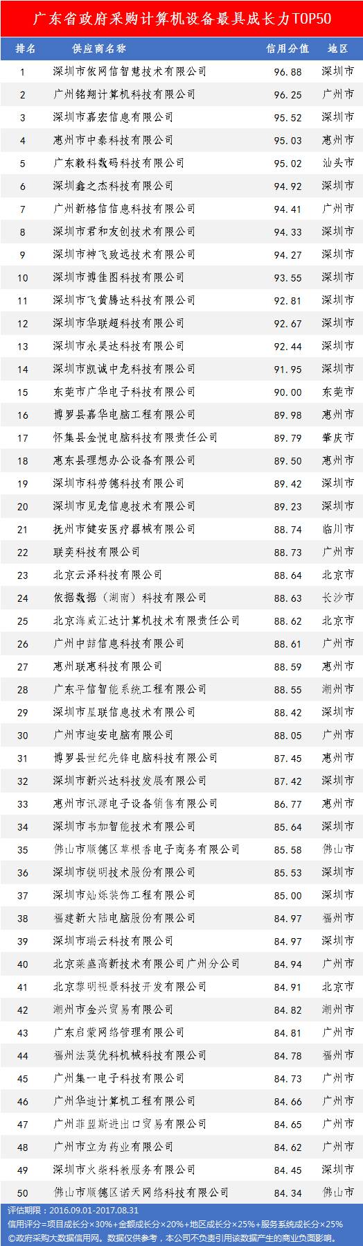 针对广东省政府采购项目采购类别众多、行业多样化、市场庞杂,采购频率高的特性,经广东省政府采购大数据研究院运用大数据搜索技术、数据挖掘与商业分析等科学途径,对广东省内数十万条涉及政府采购项目信息进行分类加工处理和多维度指标评估。设定的评估指标体系具体有政府采购行政处罚和政府采购投诉两个维度。评估数据包括近三年政府采购所有公开发布的政府采购行政处罚与投诉。最终通过上述两个维度对广东省政府采购各行业供应商重合同守法度进行信用评分并出具广东省政府采购“重合同守信用”企业公示。