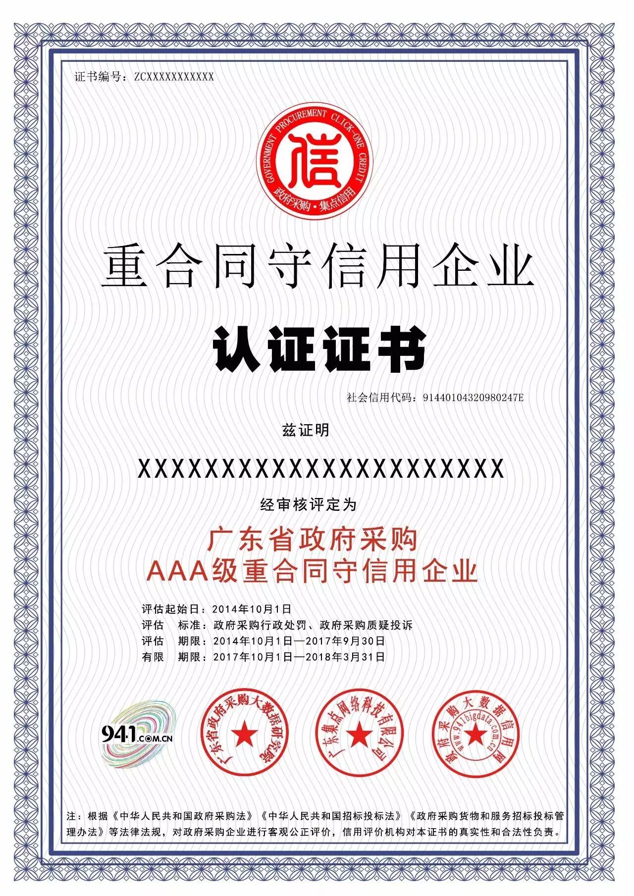 “重合同守信用”企业信用证书样板