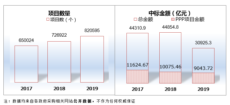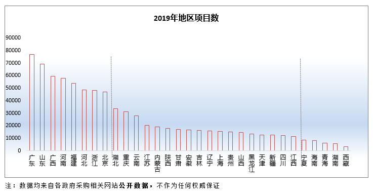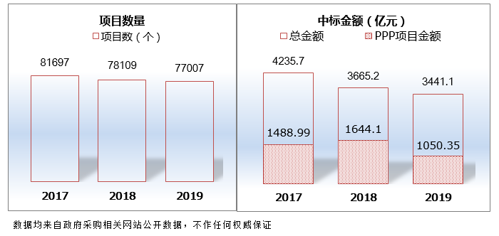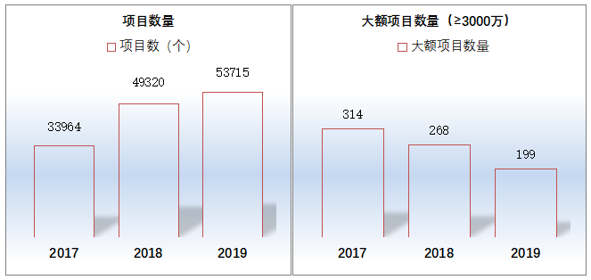 2019年度福建政府采购项目数量超50000个(含PPP项目)。从年度变化来看,福建政府采购项目数呈增长趋势,也可以看到大额项目数量是在逐年减少的。