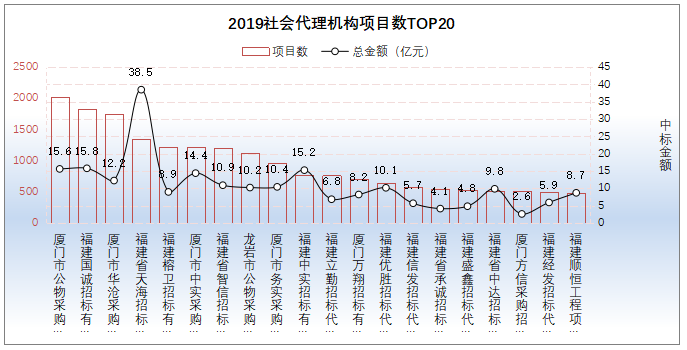 数据显示,2019年度厦门市公物采购招投标有限公司项目数超2000个,其中企业采购系统和教育系统的项目占比超50%;而福建省天海招标有限公司项目金额居于首位,其中PPP项目金额占比37.6%。