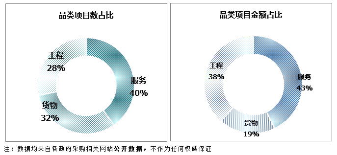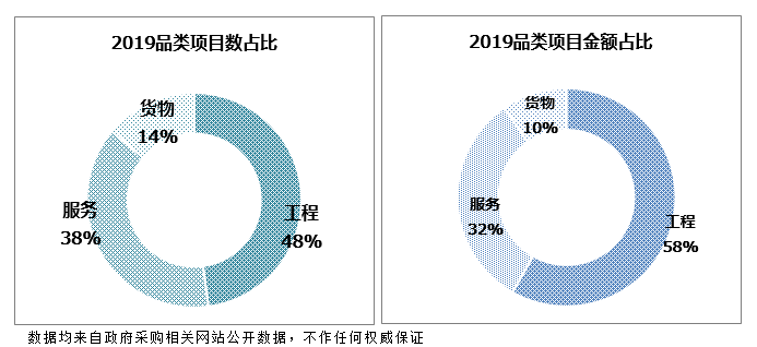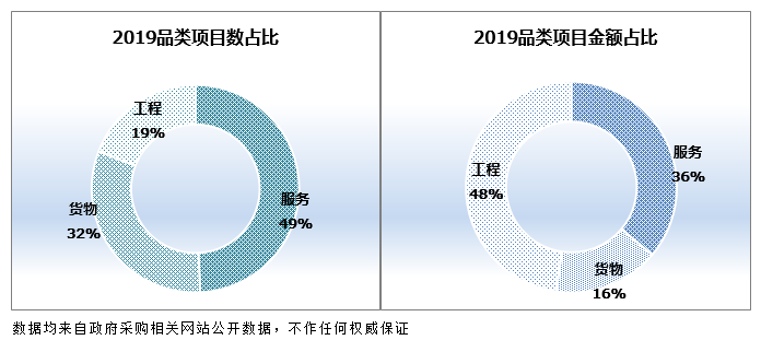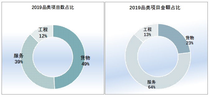 2019年度福建政府采购服务类项目数达到26031个,比重达到49.08%。服务类项目共有20464个,占比38.59%。从金额分布来看,服务类项目金额693.25亿元,占比超60%。