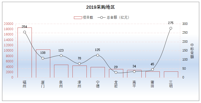 2019年度福州市和厦门市项目数均上万,分别为18599和10445个,占总项目数的34.63%和19.45%。从采购金额来看,三明市和福州市占比最大,为25.4%和23.47%。